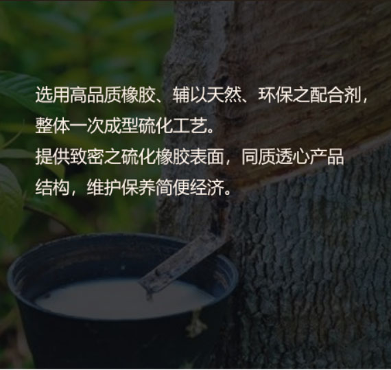 選用高品質(zhì)橡膠、輔以天然、環(huán)保之配合劑,整體一次成型硫化工藝。提供致密之硫化橡膠表面,同質(zhì)透心產(chǎn)品結(jié)構(gòu),維護(hù)保養(yǎng)簡便經(jīng)濟(jì)。 Choose high-quality rubber, supplemented by natural, envi